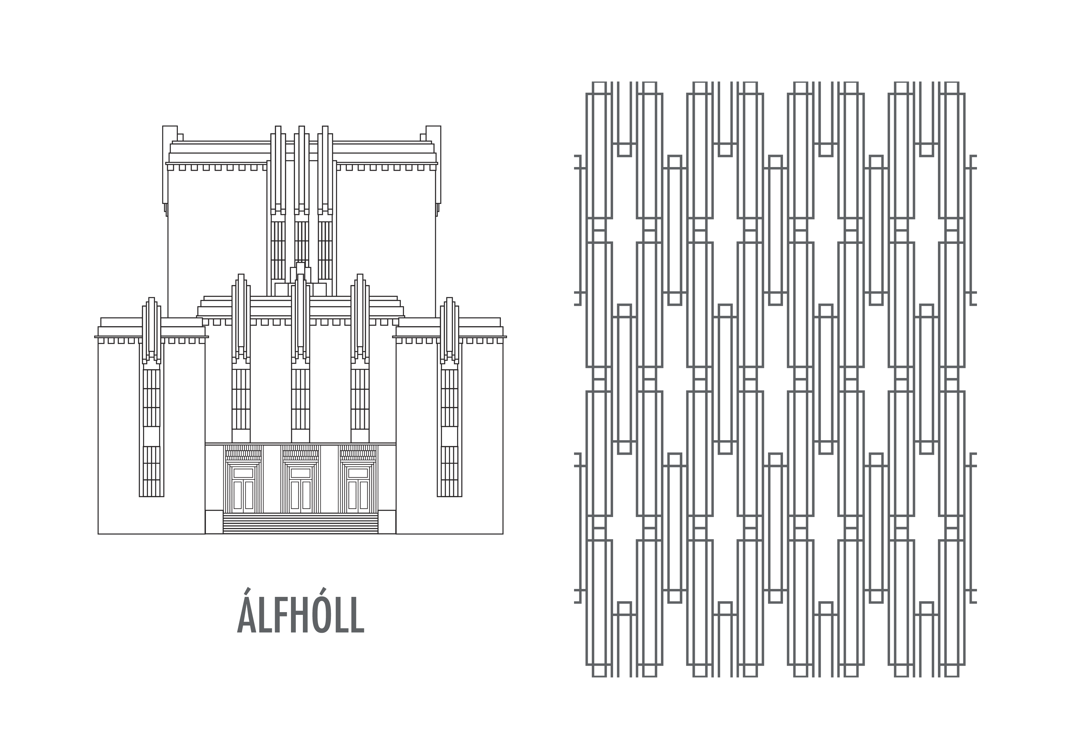 Eitt af mínum uppáhalds munstrum í línunni heitir Álfhóll og er innblásið af Þjóðleikhúsinu. Guðjón var sjálfur afar hugfanginn af fjöllum Íslands, hamrinum og stuðlaberginu, og sá fyrir sér að þar byggju álfar og huldufólk. Um gerð Þjóðleikhússins sagði hann eftirfarandi: