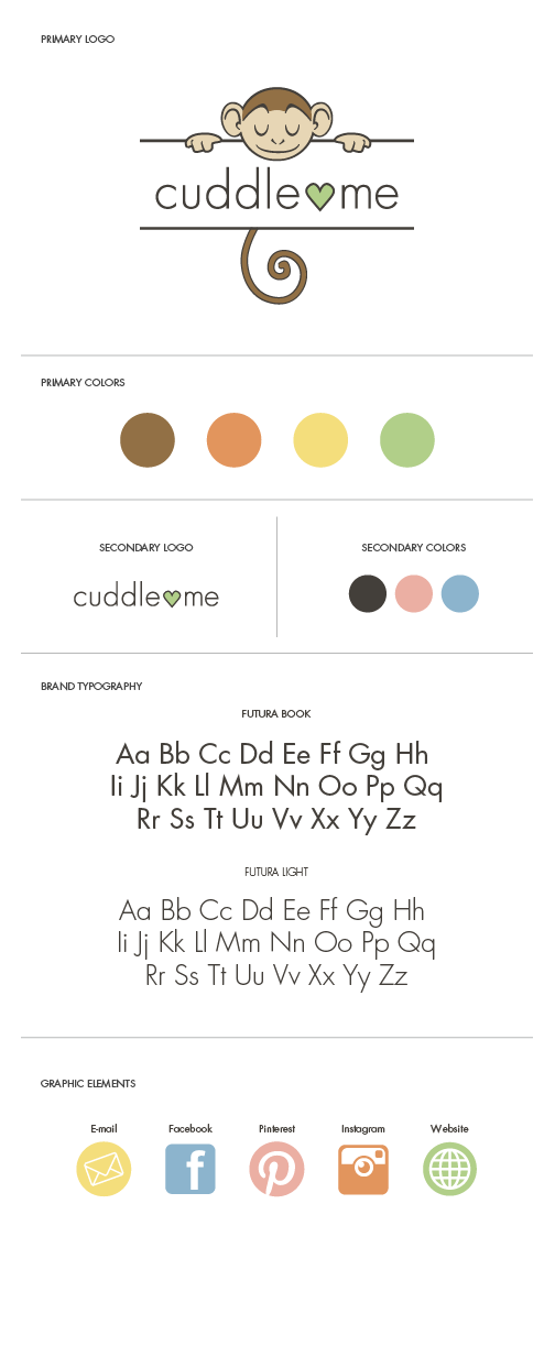 Verkefnið fólst í því að hanna lógó, umbúðir, kynningarefni og annað tilheyrandi fyrir fyrirtækið. Mig langaði til að gera lógó sem endurspeglaði nafn fyrirtækisins, Cuddle-Me, og úr varð kelinn og krúttlegur api hangandi á skilti. Fyrirmynd apans má sjá á einni samfellunni sem og skottið sem sýnir nuddstrokurnar og einkennir hugmyndafræðina. Mildir litir og mjúk form ýta svo undir tilfinninguna um notalega stund með ungabarninu.