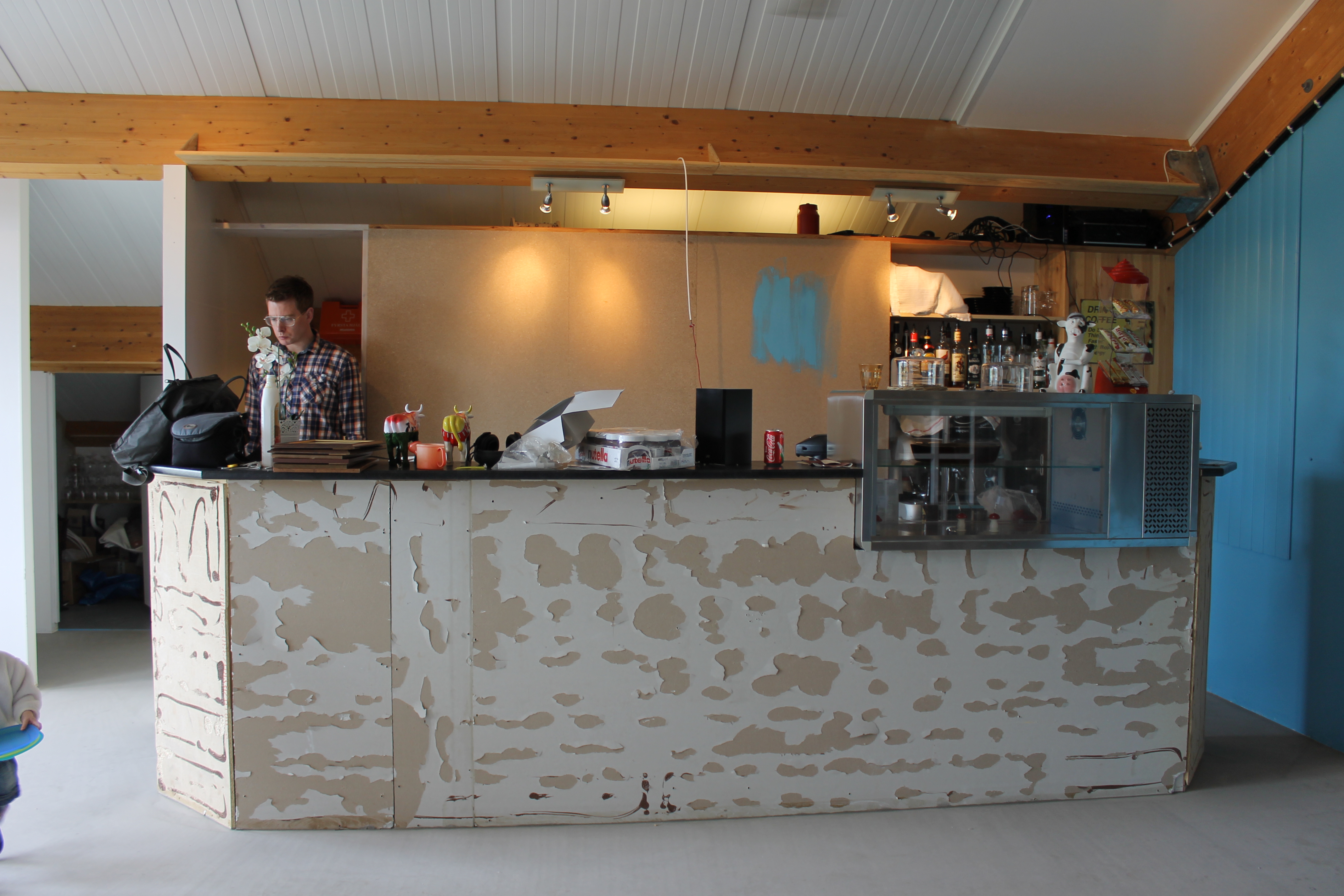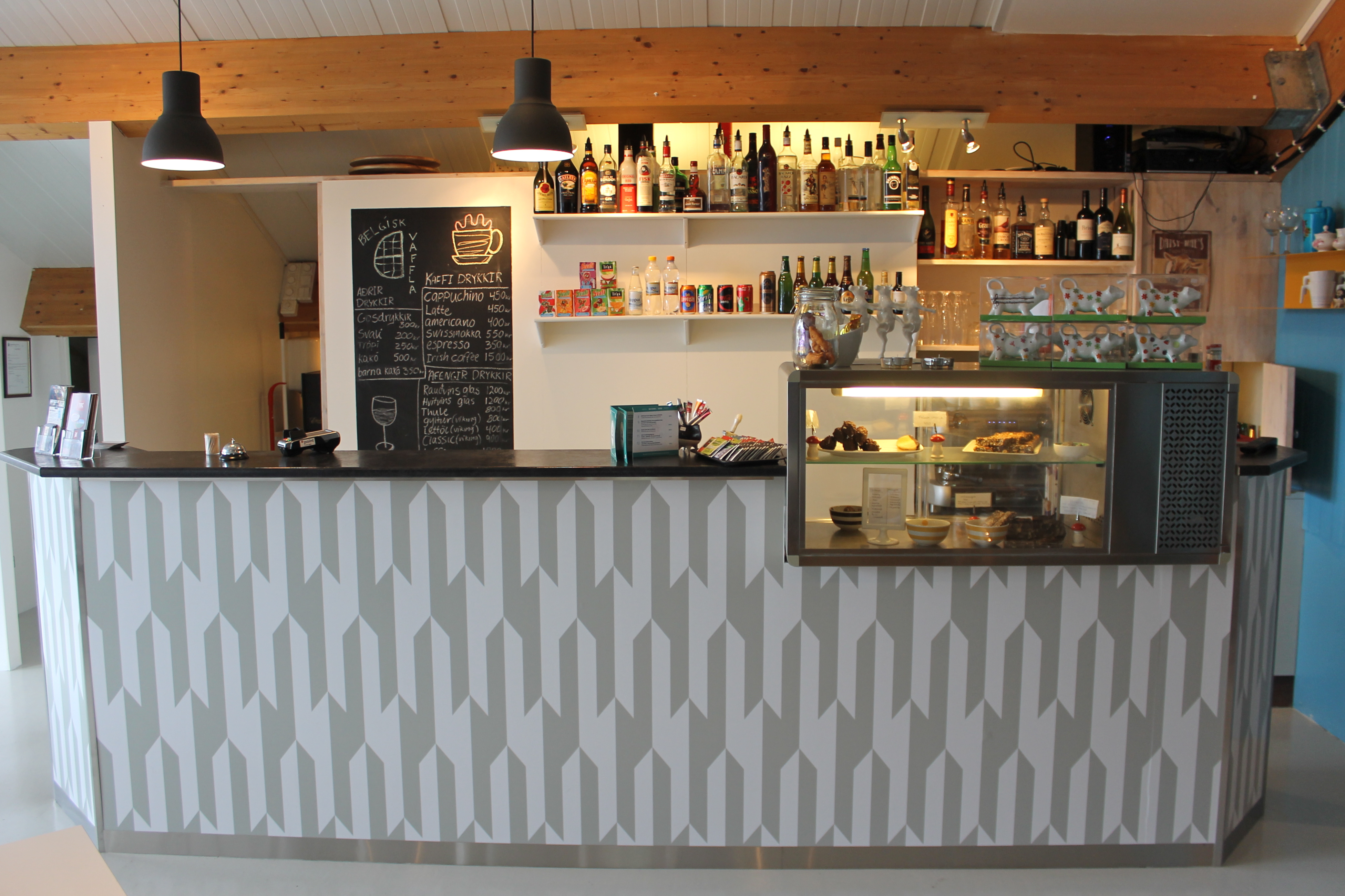 In my home region, Eyjafjörður, is a hidden gem worthy of a visit. The name is Kaffi Kú (Cowshed Café), a small café placed on top of a cowshed where visitors can enjoy a cup of coffee, home made bread and look at their beautiful cows at the same time. The owners contacted me in the beginning of summer telling me that the café was going through renovation and they wanted my assistance. During our first meeting I learned that they where interested in having one of my patterns from Hulduheimur, Drangar, on the front of their counter. Furthermore they wanted to brake away from their country style and move towards a more modern and sleek looking interiors. They had already finished the floor in concrete look, painted some walls in white and one in blue. Based on the work done, their ideas about the final look and my vision I created a mood board in Mid Century Modern style which I thought fitted the place perfectly. The style can easily be achieved with low cost solutions and I made several suggestions to which items to buy and Sesselja turned out to be quite the aesthete and surprised me with some good shopping from the capital.