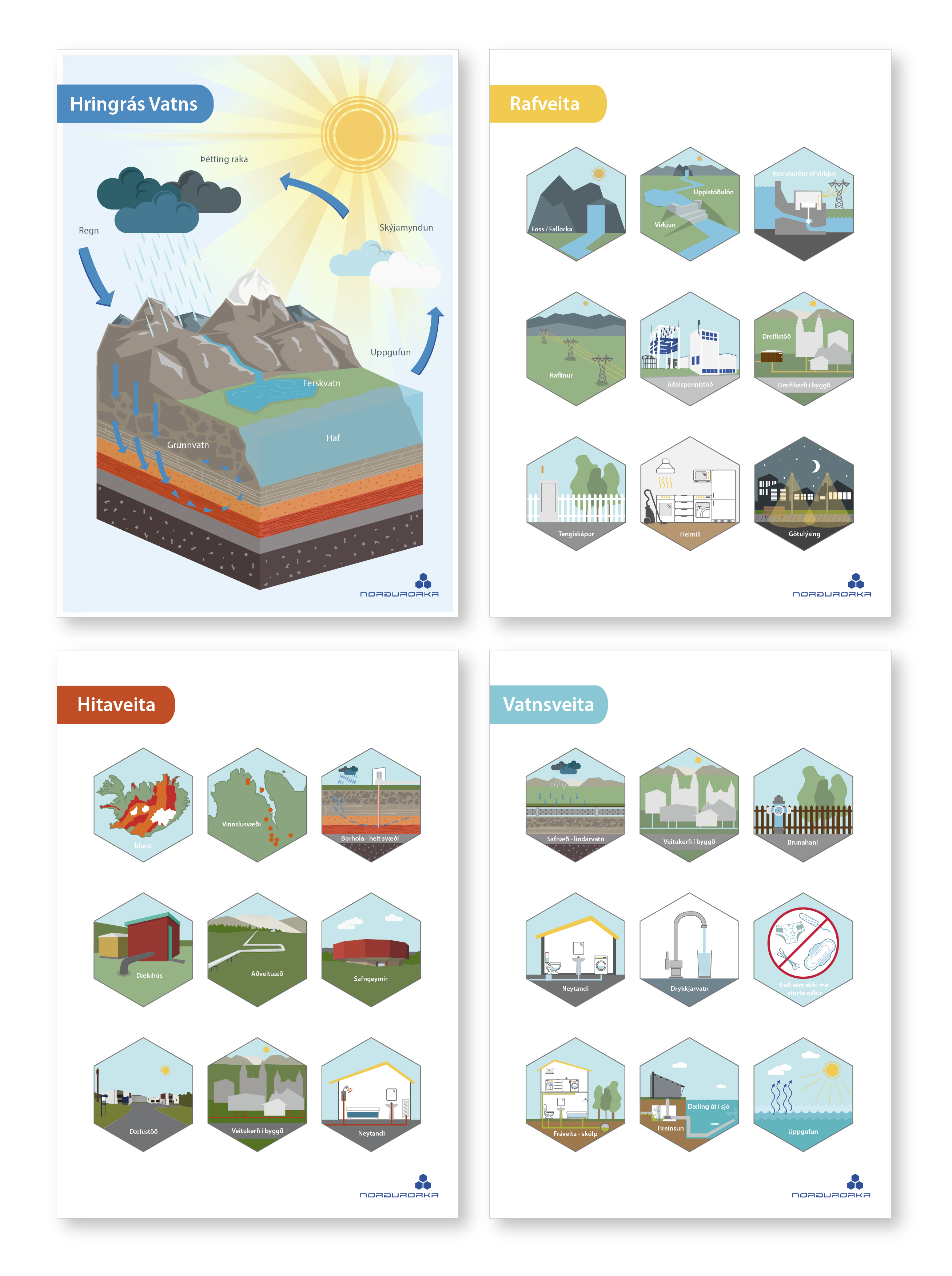 Annað verkefni var hönnun fræðsluefnis fyrir Norðurorku. Um er að ræða fjögur plagöt sem sýna: hringrás vatns, hitaveitu, vatnsveitu og rafveitu. Plagötin fyrir veiturnar eru hönnuð þannig að það má nota brot úr hverju þeirra í t.d. glærusýningu, sem myndefni í skýringartexta eða skýrslu eða hluta af auglýsingu. Myndirnar eru teiknaðar inní í sexhyrninga og vísa þannig í merki fyrirtækisins.